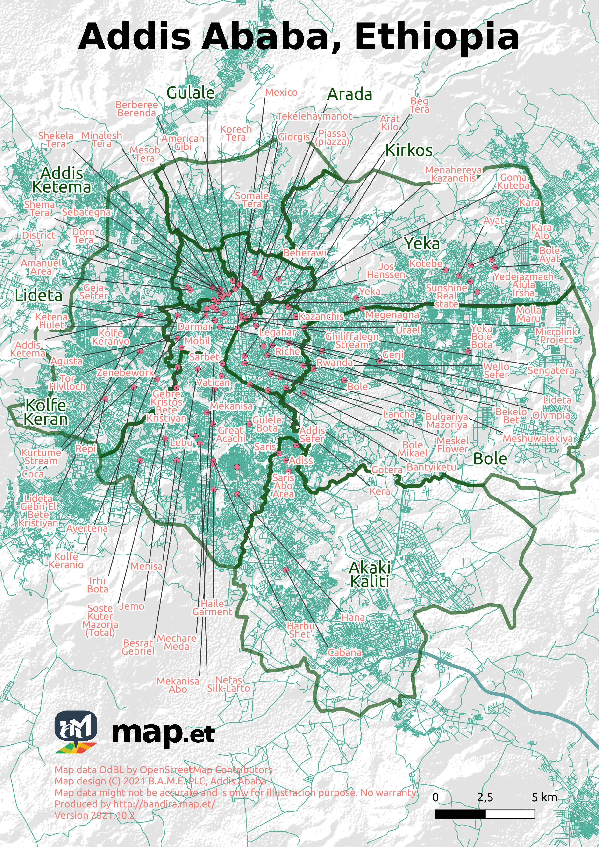 It shows the 10 sub cities and well-known areas.